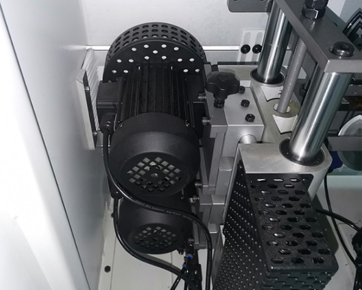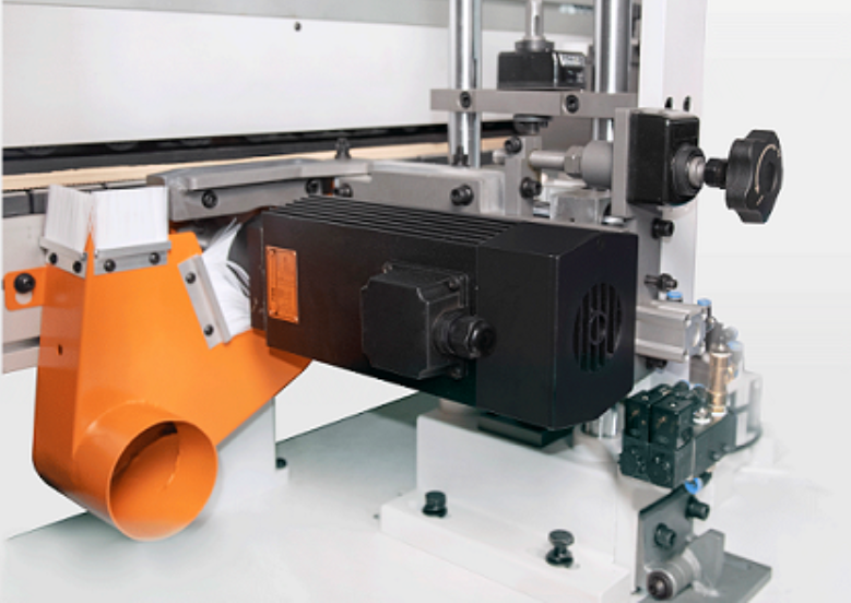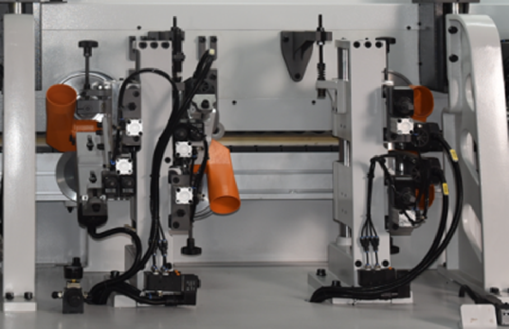 ЧЕРНОВОЙ И ЧИСТОВОЙ ФРЕЗЕРНЫЙ УЗЕЛЧерновой и чистовой фрезерный узел используется для удаления продольных свесов кромочного материала и достижения необходимого радиусного профиля. Деталь отслеживается с помощью «плавающих» круглых копиров большого диаметра (на каждом моторе). Узел черновой фрезерования свесов эффективно облегчает выполнение последующей операций чистового фрезерования, снимая свесы фрезой с прямым профилем. Узел состоит из двух высокочастотных электродвигателей. Узел чистового фрезерования свесов состоит так же из двух высокочастотных электродвигателей, оснащенных радиусными фрезами. Узел имеет пневмоперенастройку с ПУ на два типа кромки. Все двигатели узла оснащены аспирационными кожухами. |