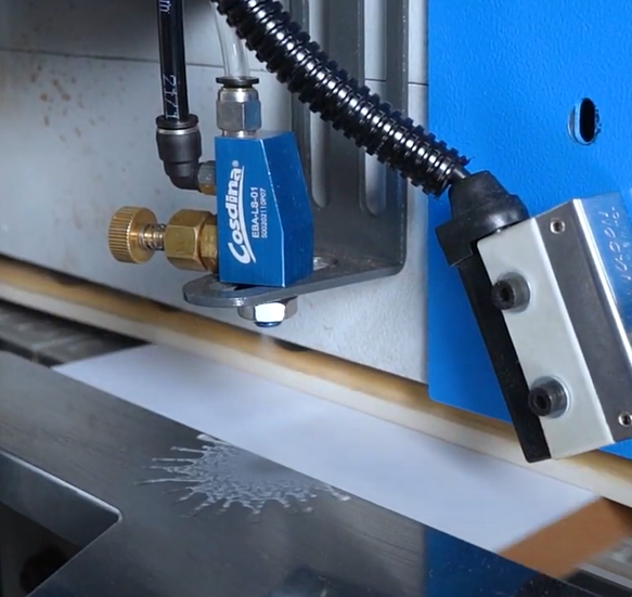 НАНЕСЕНИЕ РАЗДЕЛИТЕЛЬНОЙ (АНТИАТГЕЗИОННОЙ) ЖИДКОСТИНанесение разделительной (антиатгезионной) жидкости на верхнюю и нижнюю пласти заготовки осуществляется с помощью 2-х форсунок, расположенных перед агрегатом предварительного фрезерования (прифуговка). Разделительная жидкость не позволяет клею и стружке налипать на пласти заготовки. Форсунки имеют регулировки позволяющие настроить напор жидкости и факел. |