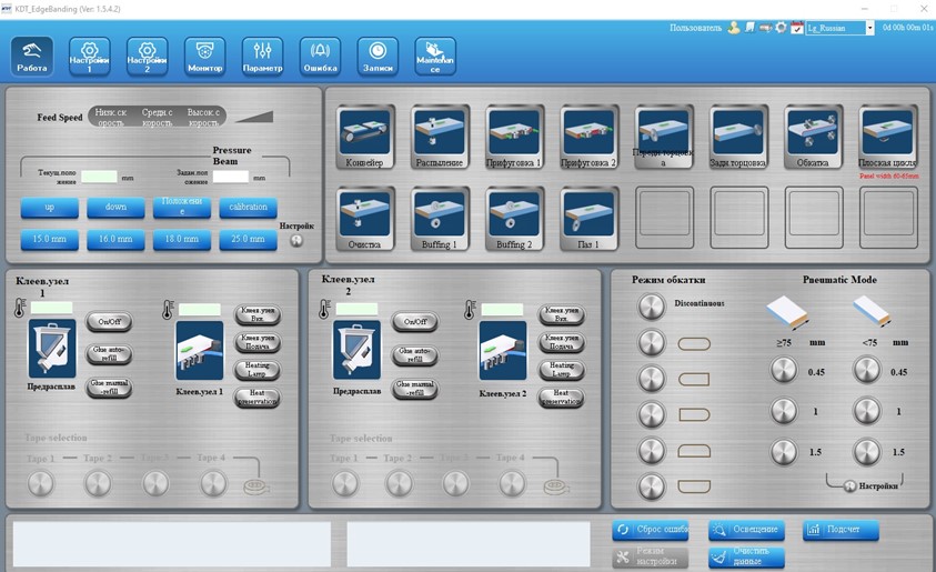 УПРАВЛЕНИЕ СТАНКОМУправление станком осуществляется с помощью промышленного компьютера на базе Windows, оборудованным широкоформатным «Touch screen» монитором. Интерфейс системы управления интуитивно понятен, прост и удобен в эксплуатации и не требуют специальных навыков и продолжительного обучения для работы. Обладает множеством функций, к числу которых относятся управление каждым агрегатом, редактирование параметров технологического процесса, регистрация аварийных сигналов, регистрация операций и напоминание о необходимости проведения технического обслуживания. Система управления русифицирована. |