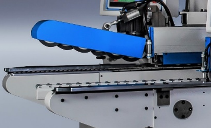 ПОДАЮЩЕЕ УСТРОЙСТВОПодающее устройство включает в себя верхний прижимной механизм с приводными роликами, установленный с базовой стороны станка и два дополнительных цепных транспортера установленных перед основным конвейером станка слева и справа. Ролики прижима большого диаметра, установлены в шахматном порядке, имеют функцию электропневматического откидывании и управления с ПУ. Данное устройство необходимо для автоматической подачи детали в станок при работе с подающим столом. Устройство надежно фиксирует и стабилизирует деталь перед подачей в станок, исключая ее перекос. Особенно это актуально для узких деталей или деталей с большой разницей между длиной и шириной. При ручной подаче деталей в станок подающее устройство заметно облегчит работу с крупными заготовками. |
